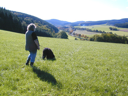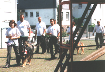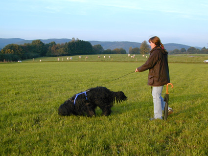 In den Jahren 2000 und 2001 haben wir mit zwei Briards bei der Rettungshundestaffel des Deutschen Roten Kreuzes in Meschede mitgearbeitet. Heute sind wir in der Rettungshundegruppe des SV in der OG-Bamenohl. Während beim RK nach der hauseigenen Prüfungsordnung des Deutschen Roten Kreuzes ausgebildet wird (die nur für das RK in Deutschland gilt), arbeiteten wir im SV zunächst nach der IPO (Internationale Prüfungsordnung). Sie gilt auf der ganzen Welt für alle Vereine, die dem FCI angeschlossen sind. Da wir über den BCD bzw. den SV Mitglied im VDH sind, gehören wir auch der FCI an. Inzwischen hat der SV eine eigene Prüfungsordnung für die Rettungshundeprüfungern I, II, und III. Am 13. September 2003 fand beim SV in der Ortsgruppe Bamenohl die erste RH-1 Prüfung statt, an der wir mit Bolero und Sari teilgenommen haben. Hier ist der Bericht, den wir für die homepage des SV geschrieben haben. Bei der Rettungshundeausbildung werden verschiedene Einsatzgebiete und damit Ausbildungsschwerpunkte unterschieden: - Ausbildung und Einsatz als Flächensuchhund (RH-FL). Er sucht nach vermißten Personen besonders in unübersichtlichem Gelände. - Ausbildung und Einsatz als Fährtenhund (RH-F). Er sucht auf nach und auf den Fährten von vermißten Personen und findet diese am Ende der Fährte. - Ausbildung und Einsatz als Lawinensuchhund (RH-L) Er sucht in Lawinenfeldern nach Menschen, die unter Schneemassen begraben sind. -Ausbildung und Einsatz als Trümmersuchhund (RH-T). Er wird allgemein dafür ausgebildet und eingesetzt, unter verschiedensten Materialien nach Menschen zu suchen. Dies kann z. B. bei oder nach Naturkatastrophen wie Erdbeben oder Erdrutschen sein; sie werden aber auch bei anderen Katastrophen wie Explosionen, Eisenbahn- oder Flugzeugunglücken usw. eingesetzt. -Ausgehend von den USA werden z. Z. auch in Deutschland Wassersuchhunde (RH-W)ausgebildet, die auf der Wasseroberfläche lebende oder tote Menschen unter Wasser anzeigen können. Nach der IP0 und auch nach der neuen SV-Prüfungsordnung wird die Prüfung jeweils in 3 Bereiche unterteilt: - Unterordnung - Gewandtheit - Nasenarbeit Nach der Rettungshundeeignungsprüfung (RH-E), die für alle