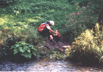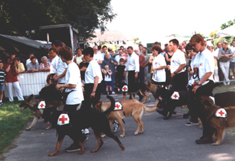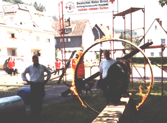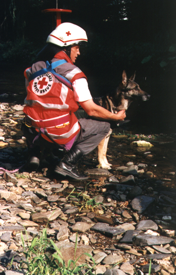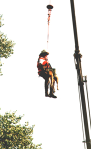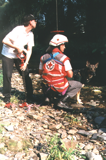 Der Höhepunkt des DRK-Sommerfestes war neben der Gemeinschaftsübung aller Hunde die Arbeit des Teams Andreas und seiner Shäferhündin Bo. In wenigen Bildern zeigen wir, wie er mit seiner Hündin mit Hilfe eines Krans über einen Fluß (Ruhr) gehoben wird und seine Hündin dann ein "vermißtes" Kind findet.