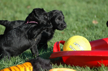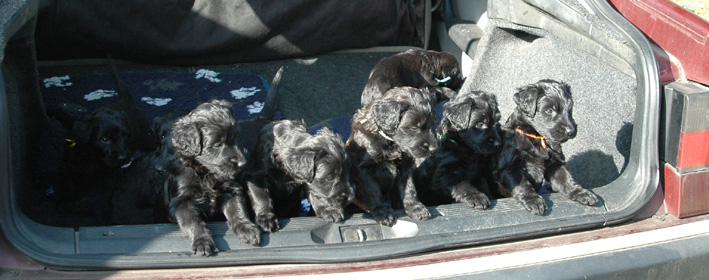 Die Welpen sind inzwischen 4 Wochen alt. Sie haben den heutigen Tag zunächst mit einer Autofahrt begonnen, ausgiebig im Garten getobt, eine köstliche Mahlzeit genossen und sind dann schließlich etwas erschöpft, aber sehr zufrieden eingeschlafen. Dann haben sie wieder gespielt, gefressen, geschlafen usw.