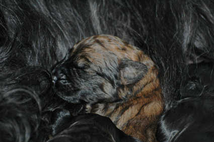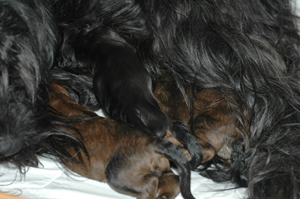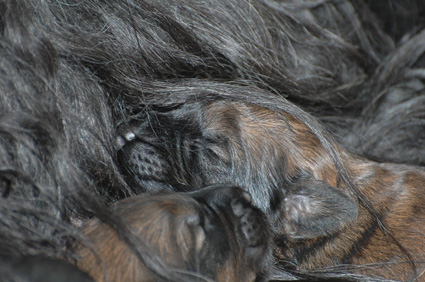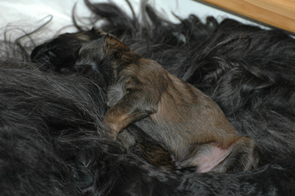 und damit die Wärme der Geschwister suchen. Auf dem Kopf des Welpen