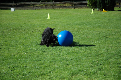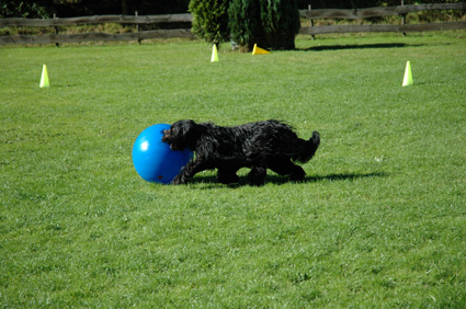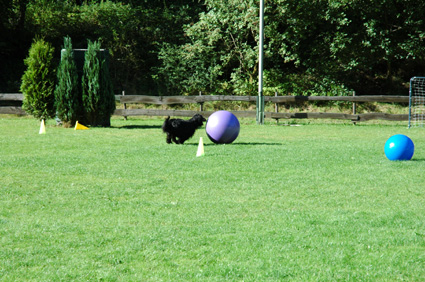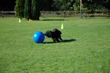 dazu das Kommando "treib". Der Ball bewegt sich und der Hund verfolgt