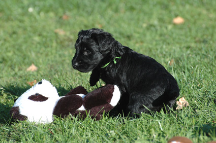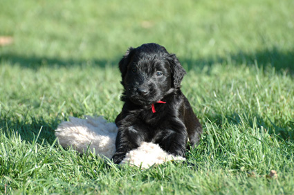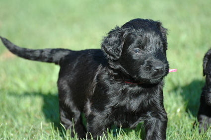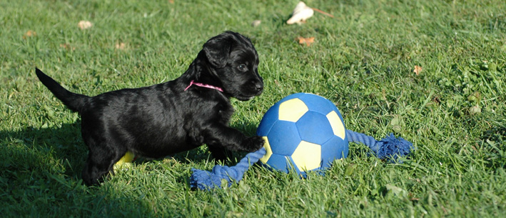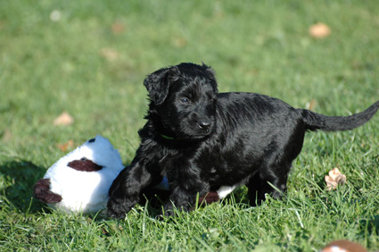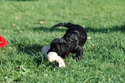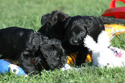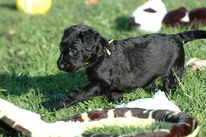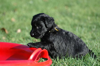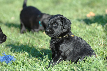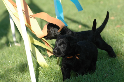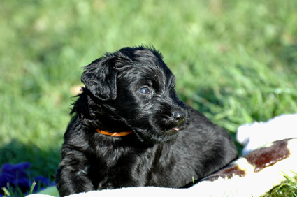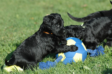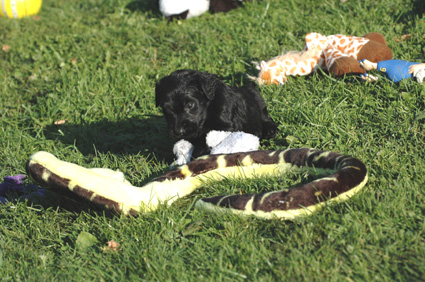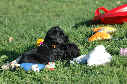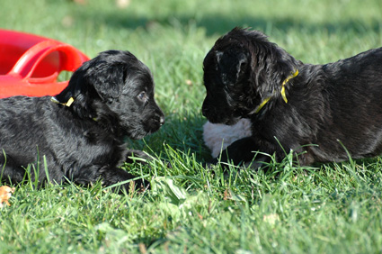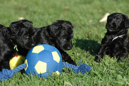 Die Welpen sind inzwischen 4 Wochen alt. Sie haben den heutigen Tag zunächst mit einer Autofahrt begonnen, ausgiebig im Garten getobt, eine köstliche Mahlzeit genossen und sind dann schließlich etwas erschöpft, aber sehr zufrieden eingeschlafen. Dann haben sie wieder gespielt, gefressen, geschlafen usw.