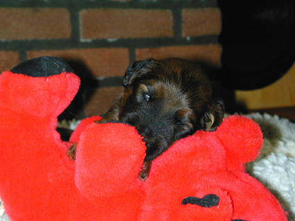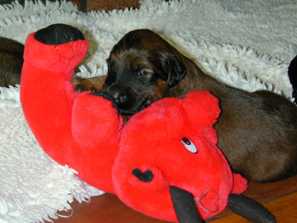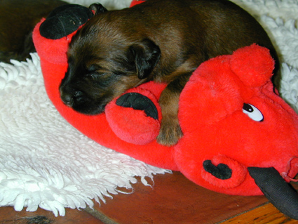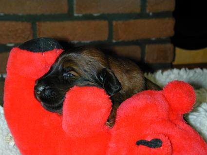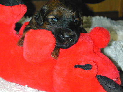 Die Welpen haben jetzt Augen und Ohren geöffnet. Sie erkunden ihre Umwelt. Ein fauver Rüde hat einen neuen Freund gefunden. |