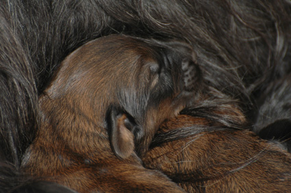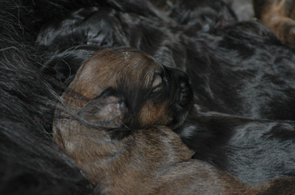 und damit die Wärme der Geschwister suchen. Auf dem Kopf des Welpen