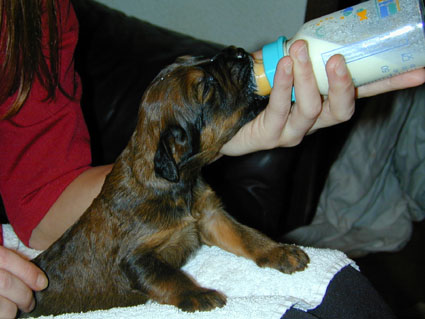 Die Welpen bekommen Hundemilch aus der Babyflasche.
